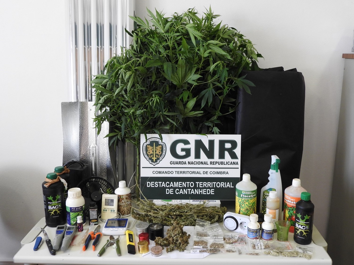 No âmbito de uma investigação pelo crime de tráfico de estupefacientes, os militares deram cumprimento a um mandado de busca domiciliária, onde desmantelaram uma estufa de cultivo de cannabis no interior de uma habitação. No decorrer da ação policial foi possível apreender: