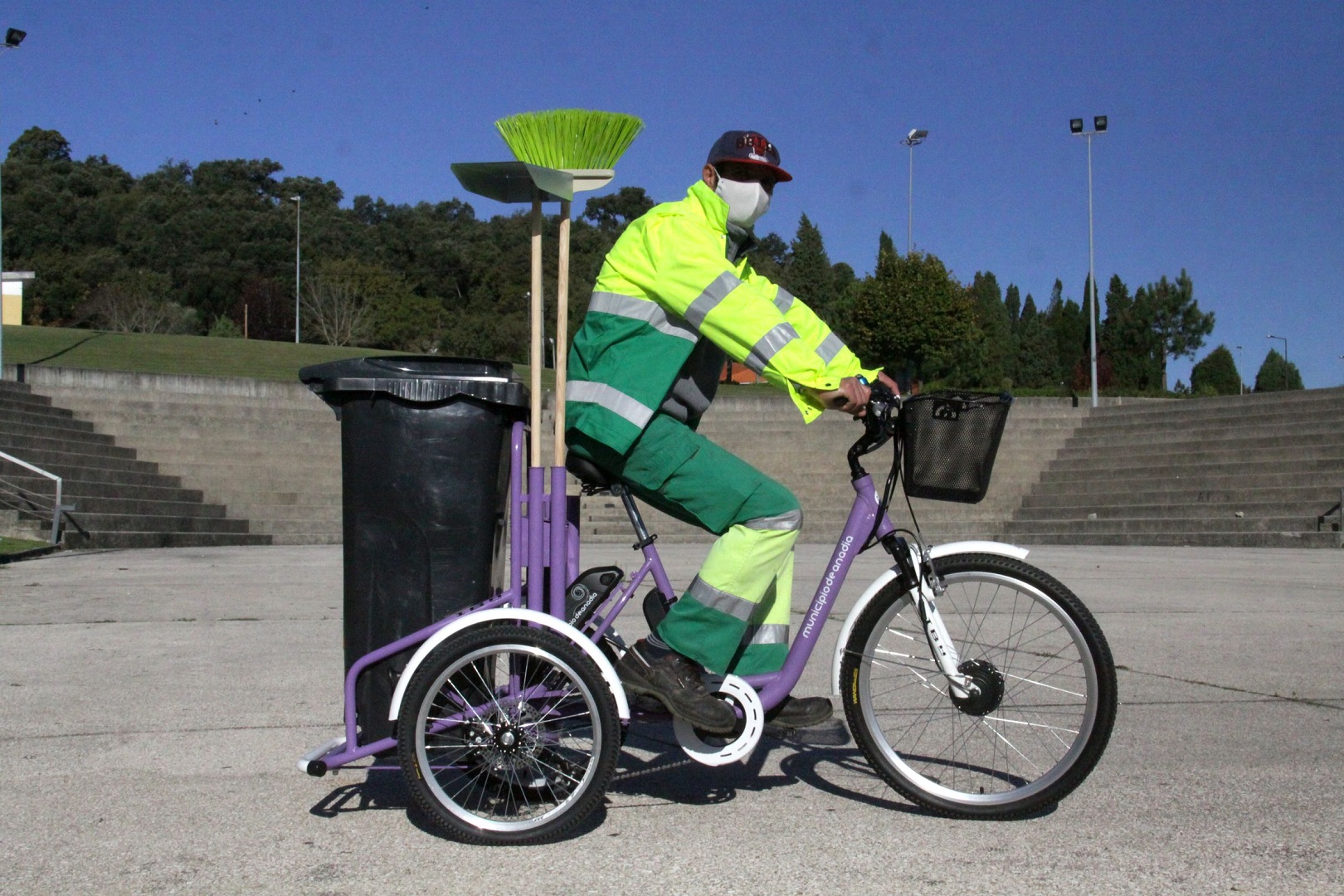 A bicicleta, com uma autonomia de 40 kms, tem acoplado um contentor de 120 litros e ainda quatro suportes para a colocação de vários utensílios, nomeadamente vassoura, pá, entre outros.