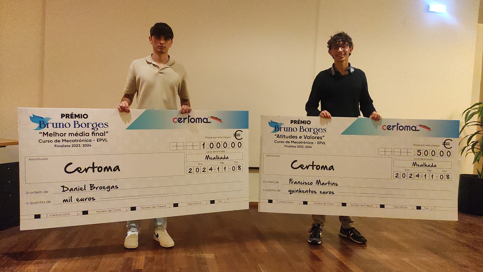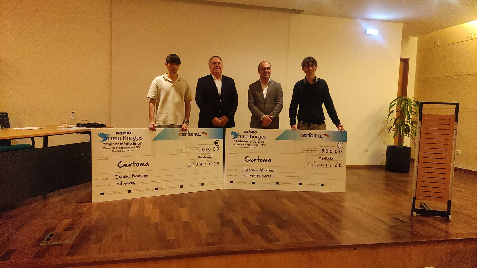 Durante a cerimónia foram também entregues dois Prémios Bruno Borges, pelo segundo ano consecutivo, um incentivo da Certoma, que prestigia e homenageia um funcionário da empresa e antigo aluno da EPVL, falecido, em 2023, num acidente de viação. Assim, os alunos finalistas do curso de Mecatrónica Daniel Broegas e Francisco Martins, receberam, respetivamente, o Mérito Académico (melhor média final de curso), no valor de mil euros, e Atitudes e Valores, no valor de 500 euros.