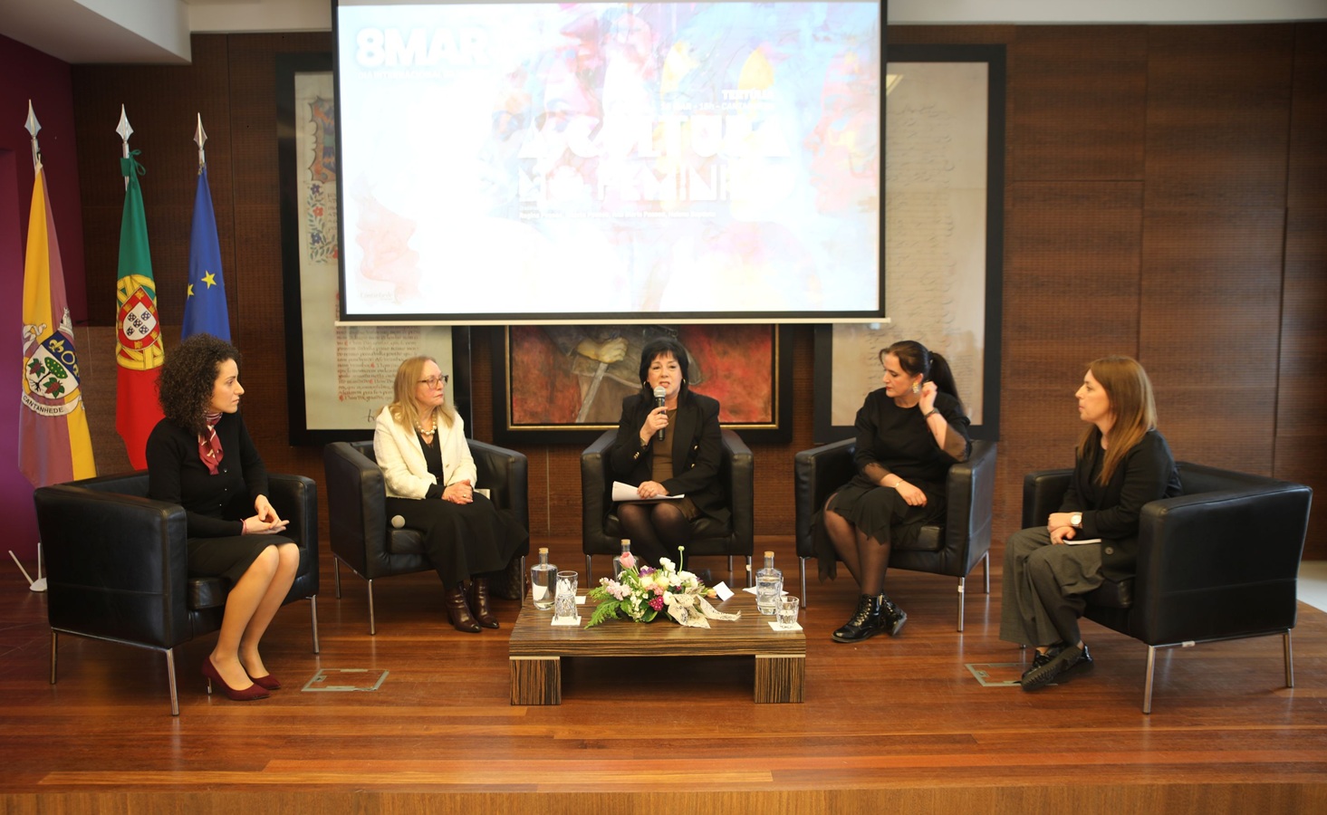 A “Cultura no Feminino” foi o mote para a tertúlia realizada esta terça-feira, 10 de março, pelo Município de Cantanhede e que assinalou o Dia da Mulher, que se comemorou a 8 de março. Com o salão nobre dos Paços do Concelho lotado, a conversa, moderada pela presidente da Câmara, Helena Teodósio, teve como intervenientes Isolete Pessoa, escritora; Ana Maria Pessoa, dirigente associativa; Helena Baptista, instrumentista e também dirigente associativa; e Carolina Pessoa, fadista.