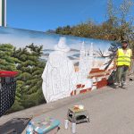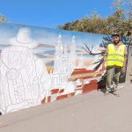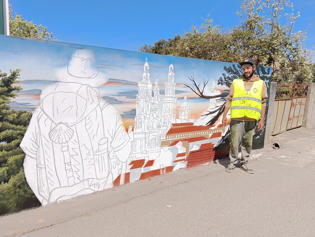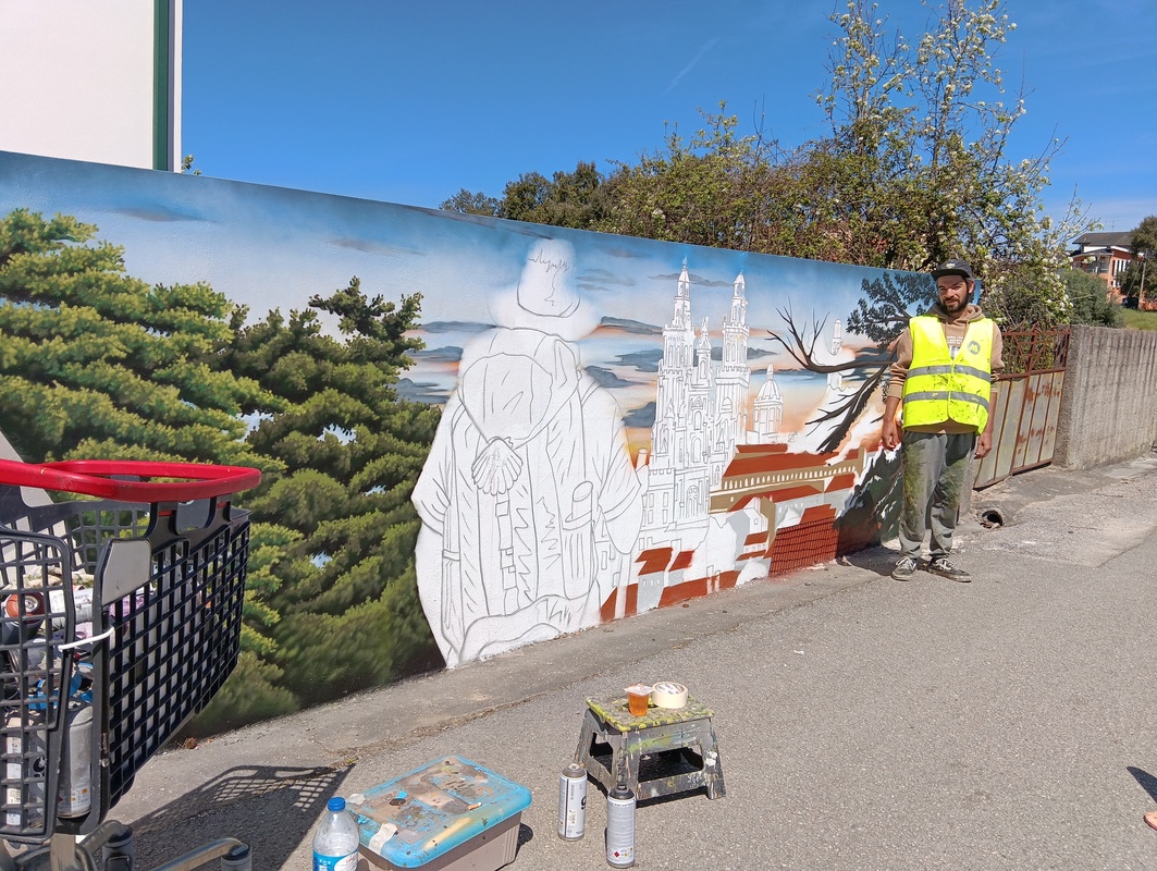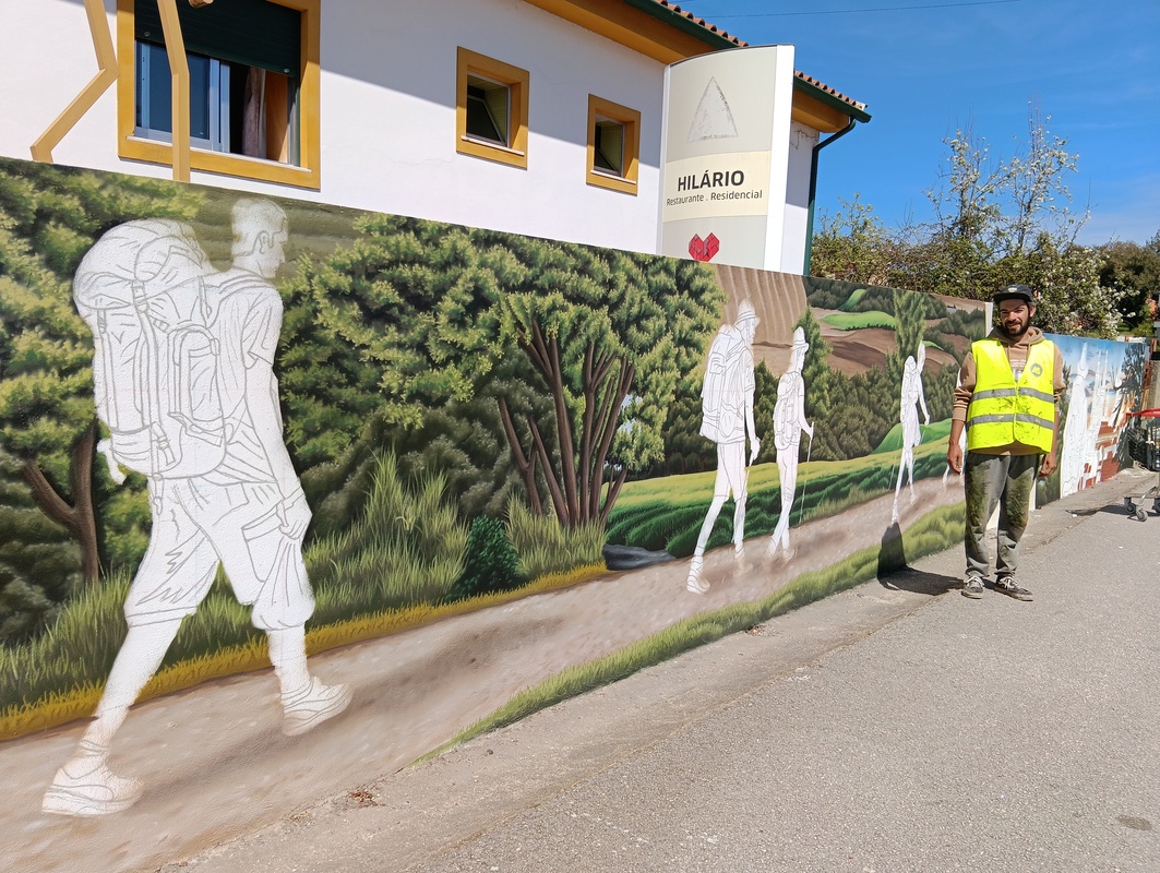 O artista Ricardo Henriques, de 31 anos, está na Mealhada, concretamente em Sernadelo, há cerca de duas semanas a desenhar e pintar um mural numa homenagem aos peregrinos de Santiago de Compostela no muro do Albergue de Peregrinos da Mealhada.